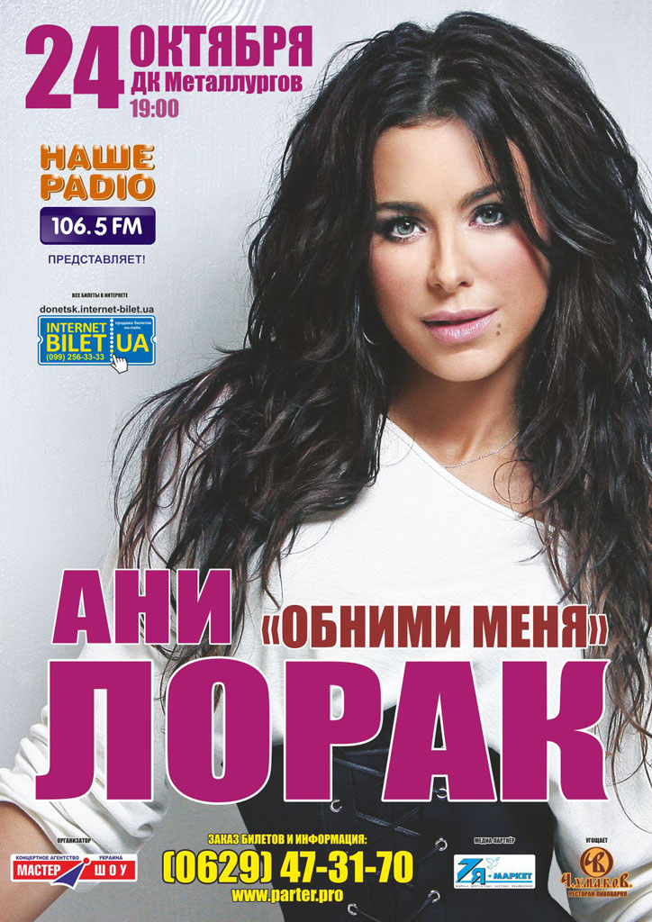 Ани Лорак состоится 24 октября 2012, 19:00, среда в ГПК «Український дім» (ДК Металлургов). С помощью сервиса internet-bilet.ua, Вы сможете с легкостью забронировать, заказать и купить билеты на интересующий Вас концерт, спектакль, оперу, балет, мастер-классы, спортивные и детские мероприятия, оплатив их самым удобным для Вас способом: через интернет банковской картой VISA/MasterCard, наличными или курьером, если сделаете заказ билета c доставкой.