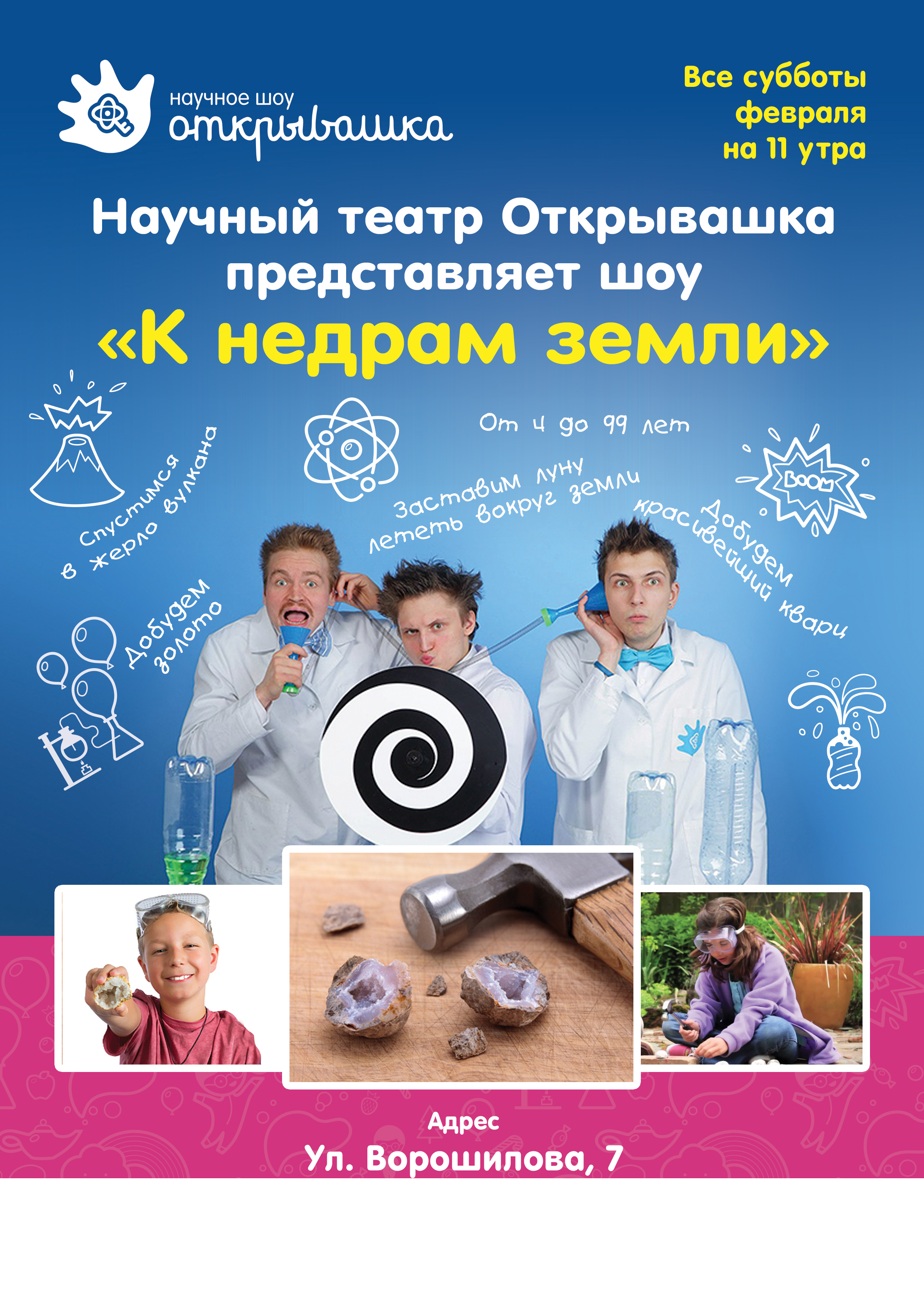 К недрам Земли відбудеться 28 лютого 2015, 11:00, субота в тест. За допомогою сервісу internet-bilet.ua, Ви зможете з легкістю забронювати, замовити та купити квитки на концерт, спектакль, оперу, балет, майстер-класи, спортивні та дитячі заходи, що Вас цікавлять, оплативши їх найбільш зручним для Вас способом: через інтернет банківською карткою VISA/MasterCard, готівкою або кур'єром, якщо зробите замовлення квитка з доставкою.